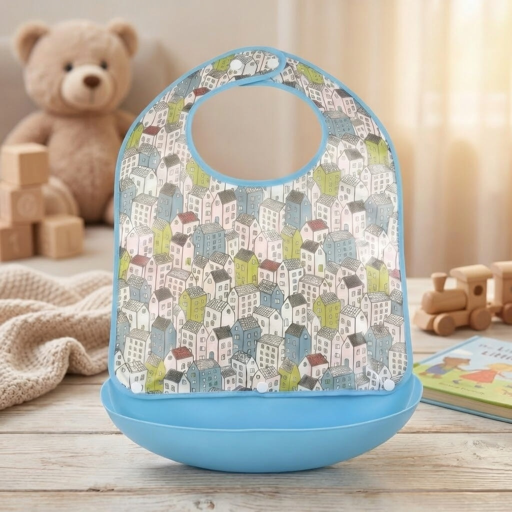 Découvrez le Bavoir Silicone Village Enchanté, un protège-menton pour bébé au design original et ludique : un village fantaisiste de petites maisons pastel (bleu clair, rose saumon, vert menthe, gris perle, ocre doux) entassées comme vues d'en haut, sur fond bleu turquoise semi-transparent avec collecteur amovible bleu vif. Fabriqué en silicone souple et sécurisé, sans BPA, il protège efficacement des bavures tout en stimulant la curiosité visuelle de votre enfant grâce à son motif unique inspiré d'un conte européen. Facile à nettoyer (lave-vaisselle haut), imperméable et antidérapant, il allie style, praticité et douceur pour les repas joyeux.